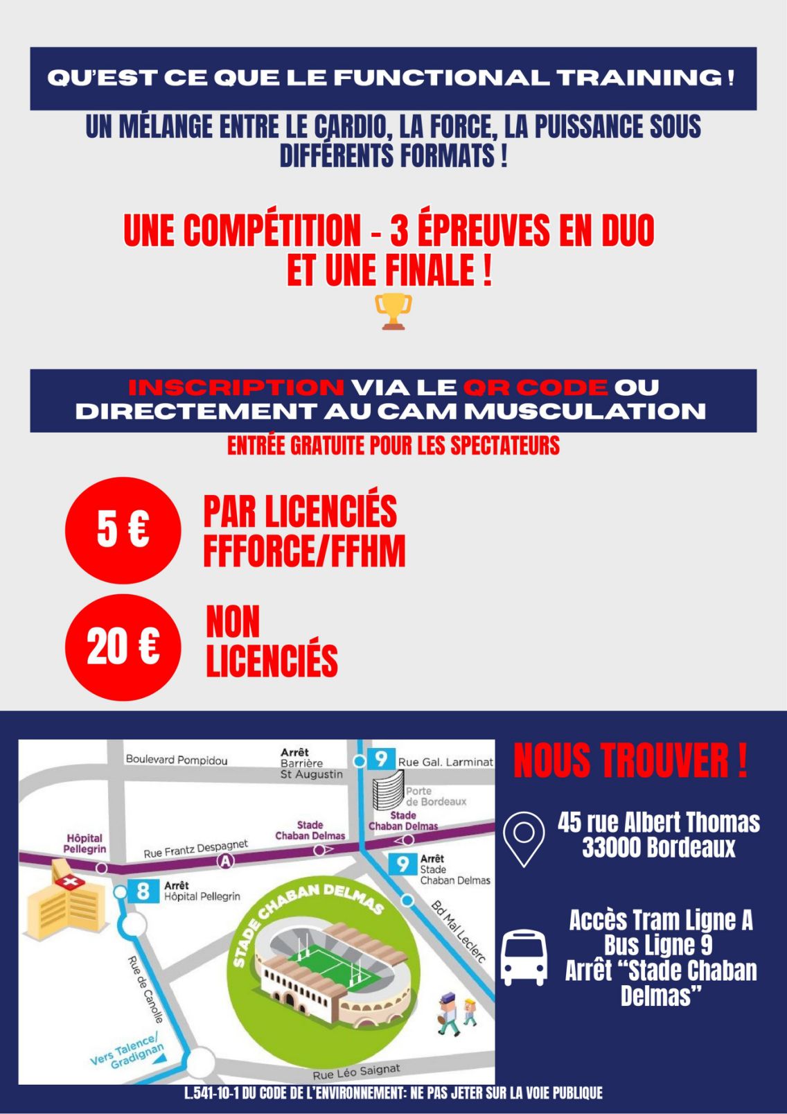 WHERE? 📍 CAM Musculation Bordeaux 45 rue Albert Thomas, 33000 Bordeaux (Access: Tram A / Bus 9 - "Stade Chaban Delmas" stop).